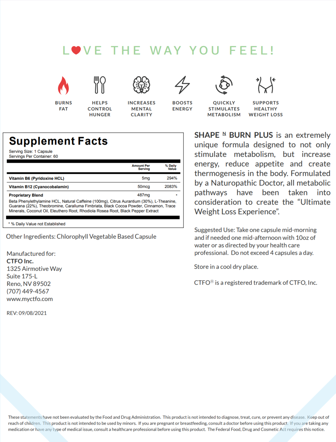 SHAPENBURN PLUS™ is a synergistic formula of 14, fast-acting ingredients. This exclusive formula can be a catalyst for noticeable weight loss. Expertly formulated to support elevated mood & energy, reduce appetite, decrease carbohydrate cravings, and increase metabolic efficiency to release stubborn stored fat and burn it for energy. Formulated by a Naturopathic Doctor, select clinically researched weight loss enhancers have been combined to help speed up the journey to your ideal weight.